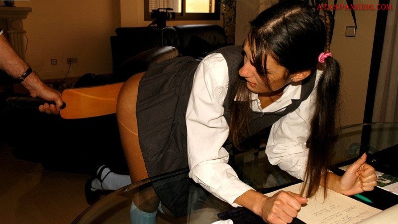 Lisa’s bottom is looking very sore, red bruised and blotchy. As she stands there, her knickers pulled down to mid thigh – holding her skirt bunched up around her waist, Mr Lewis comes back to check on her. He lectures her and it becomes clear just why she’s received such a sore bottom. Her geography knowledge is practically non-existent. However, she assures him that she has learned her lesson. So now Mr Lewis turns his attention to English Literature. Her homework was to write a poem about the countryside. The silly girl tries to pass off William Wordsworth’s Daffodils as all her own work. He humours her and praises her for writing such a beautiful poem and she has the audacity to sit there with a self-satisfied smirk on her face. The smirk turns to horrified dismay, when she realises that he knows she’s lying. He brings out the large leather paddle and goes on to paddle her bare bottom. She cries and jumps up after each stroke, but he is determined to teach her a lesson she won’t forget in a hurry. Although her bottom was already very sore from her previous spanking – now he brings back a flush to her cheeks. She struggles to break free, but he has too firm a hold on her. Then ordering her to sit down – she objects because her bottom is so sore. Yet sit down she has to do. Now he’s leaving her alone for two hours to indeed write an original poem. Will she? Can she? Or is her bottom going to suffer again?