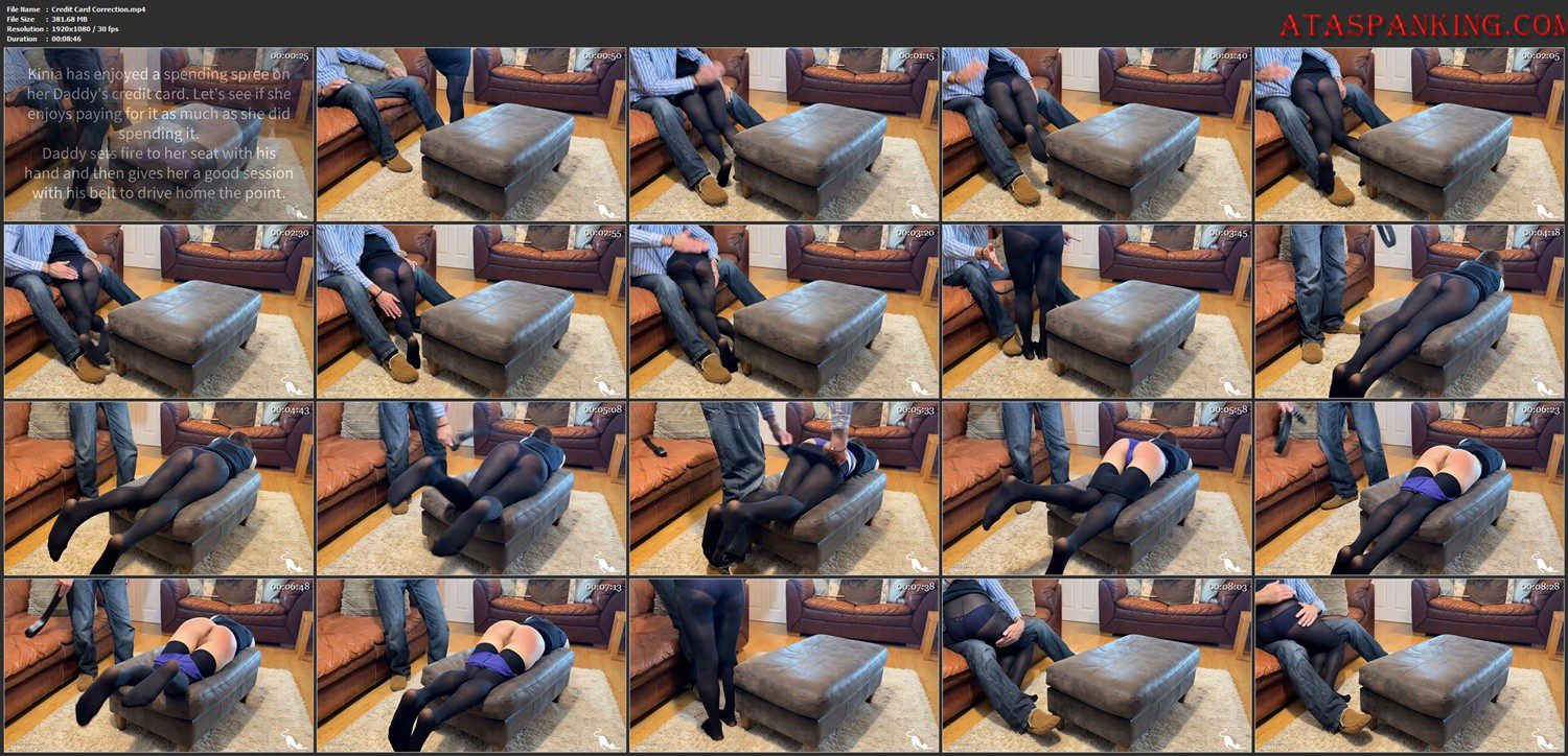 Credit Card Correction – Kinia pays for her credit card overspend with an over the knee spanking and a taste of her Step-daddy’s belt on her bare bottom.