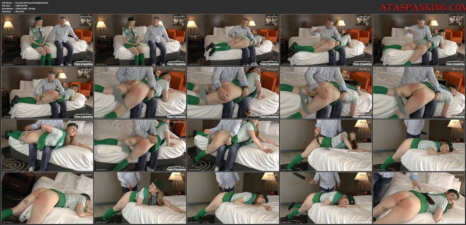 Please welcome a lovely newcomer to our site, Poppy Nightingale – a lifestyle player we’ve enjoyed spending time with at various parties recently. We’re delighted she trusted us to film together, and this is her very first appearance at AAA. Naturally, John insisted she be spanked in her adorable, authentic Girl Scout uniform. For extra fun, her sash cheekily spells out “SPANK,” and her badges are all spanking-themed (see how many you can spot in the film). In this not-so-traditional scout shenanigan, the storyline centers on a little “embezzlement” – or rather, the mild misappropriation of mint cookie funds which earns her a stern troop-leader spanking before she’s sent home to face her stepfather’s wrath. “A spanking at Scouts means a spanking at home,” he declares, thoroughly unimpressed by her light-fingered behavior. Enjoy Poppy’s bratting protests as her glorious bare bottom receives a firm hand spanking over a paternal lap, followed by a sound strapping splayed across the bed with John’s trusted, thuddy leather Reformatory strap. If you love uniform spankings, this one’s for you!