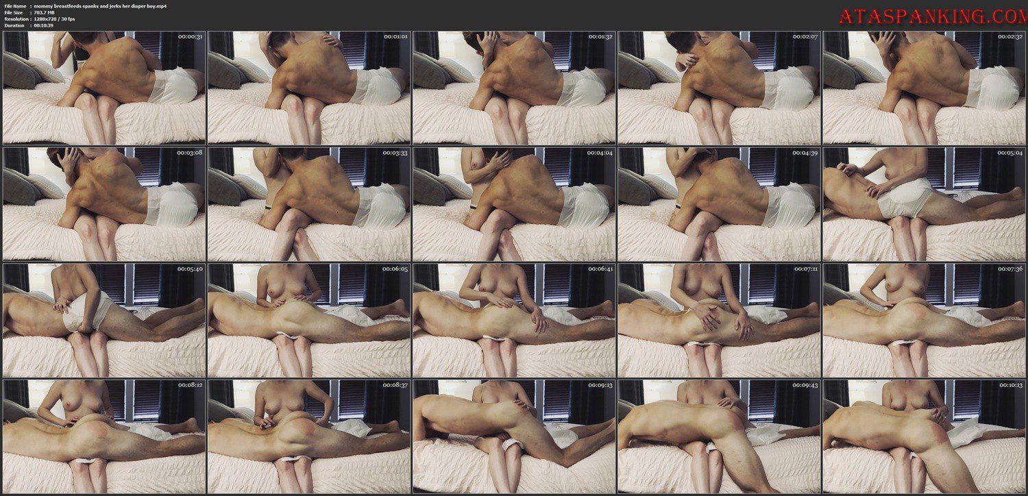 Mommy gently breastfeeds her diaper boy in her lap but needs to stop to teach him a lesson after he starts touching himself through his diaper. She bends him over her knee for a spanking, and he still can’t help himself from humping her lap. Eventually, step-mommy takes his cock in hand to help get rid of those dirty thoughts.