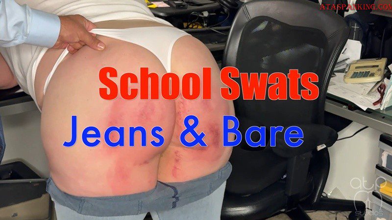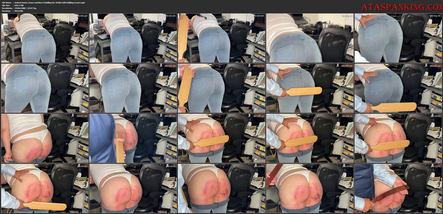 Much to the pleasure of the principal, all the jeans, Stella owns, are thin and tight, making the perfect target. She has no stranger to his office, inevitably, leaving with a sore bruised bottom. Making sure she understands why she is being paddled for disruptive behavior on the bus, and the parental consent given to punish her with maximum swats. Measuring the big Principals Paddle across the skin tight seat of her jeans, he taps her bottom a few times. Her jeans are thin and tight, pulled taut across her bent over cheeks, the outline of her thong panties and shapely buttocks clearly on display. Pulling back the paddle, whoosh and a crack as his muscular frame delivers an earsplitting swat. Stella, gasps, crying out as her already sore bottom is paddled. Demanding she remove her jeans, she begs him for mercy, confessing her step dad beats her hardly when she gets in trouble at school. Unbuttoning, she peels her pants down, revealing her bruised bottom in skimpy white thong panties. Delivering a fresh dozen firm swats, Stella is sobbing contritely by the conclusion. 2nd camera angle of entire scene – 24 swats with the school paddle