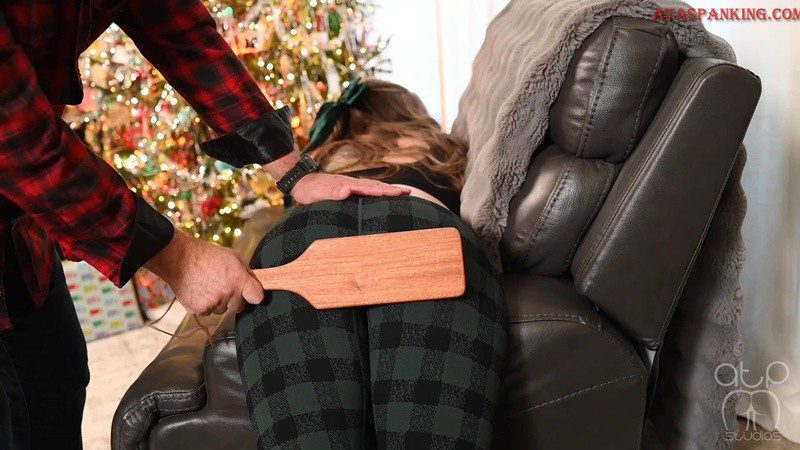 Under the tree at Christmas time is the perfect time to deal with all the behavior and let go og guilt at the end of the year. Troublemaker is bent over the chair in front of the tree in a sports bra, leggings and matching hair bow, the perfect spanking submissive. Her bottom is perfectly round, outlined in skin tight plaid leggings. The strap bouncing off spandex makes a satisfying crack as the heat is delivered. Next, his belt beats a rhythm on her shapely backside. The Cane is her most feared implement she always struggles to take. She quickly begs for the paddle instead. He is all to happy to deliver a lusty paddling to her perfectly presented bottom.