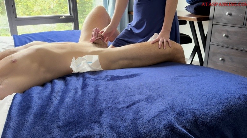 After plugging his bottom and putting him in a chastity cage and diaper, step mommy takes Max over her knee for an embarrassing, uncomfortable spanking. She scolds and teases him through the spanking as he helplessly kicks his legs, eventually taking his diaper off to admire his plugged ass and caged cock. There’s no doubt Max would be hard if he wasn’t caged. He loves being over step-mommy’s knee like this, but sometimes it’s better to keep him frustrated 😉