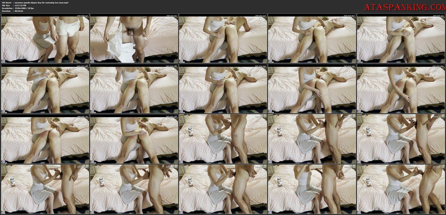 Max has been cumming too soon again, and step-mommy is not happy. She takes his diaper off and puts him over her knee for a bare-bottom spanking while she scolds him about what an immature boy he is. Max is hard throughout, and step-mommy decides to test if he’s learned his lesson by stroking his cock and making sure he doesn’t cum. Max tries his best, but of course he ends up cumming too soon – right on step-mommy’s lap! She pulls him back over her knee to continue his spanking.