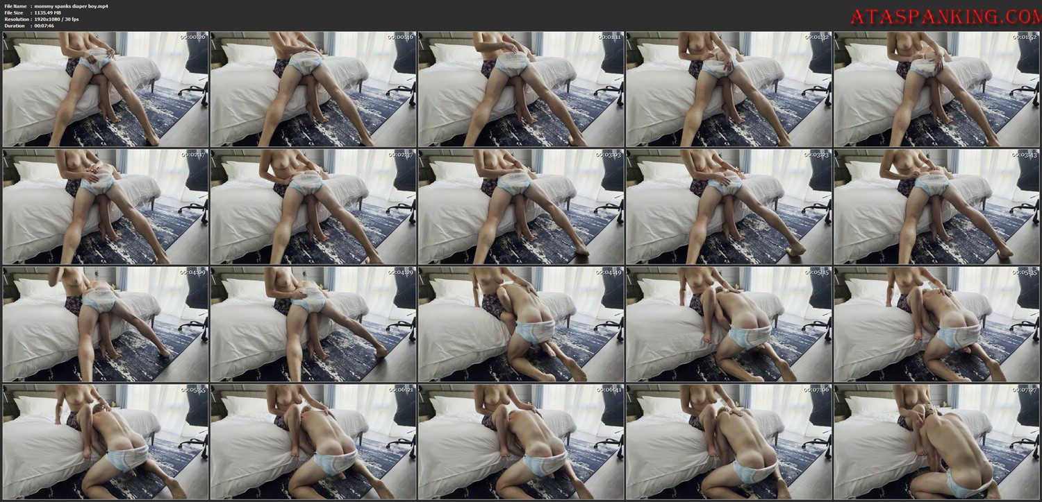 Step-mommy puts Max over her knee for a maintenance spanking, pulling down his puffy, printed diaper before reddening his ass with her hand. Max can’t seem to stop himself from grinding against her lap, even through the pain of the spanking, so step-mommy decides to make things a bit more humiliating for him. She tells him to get on his knees and hump her leg through his diaper, while it’s still halfway pulled down and his red ass is on display. Will she let him cum like this?