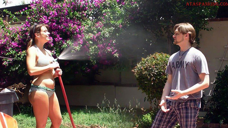 Girl teases boy by hosing him with a garden hose. Boy pulls girl over his knee and gives her a sound otk spanking. First a handspanking on her bikini panties and on the bare, then second dose with a hairbrush on the bare and on her bikini panties. Girl screams a little bit, fidgets and squirms.